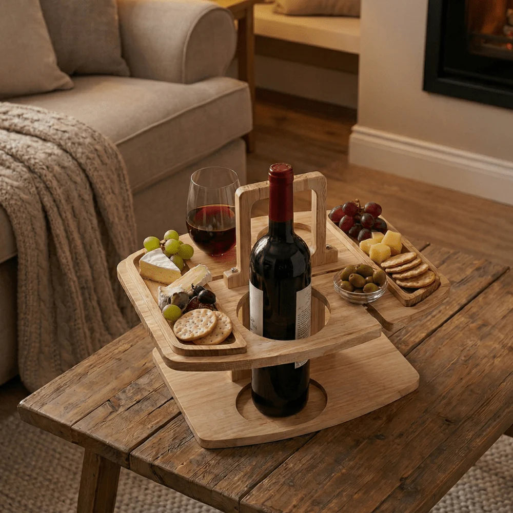 Of je nu een picknick organiseert in het park, een romantisch moment op het strand hebt of een gezellige borrel in de tuin, deze compacte wijntafel zorgt ervoor dat alles netjes en stabiel op zijn plek blijft. De slimme uitsparingen houden een wijnfles en glazen stevig vast, zodat omgevallen glazen verleden tijd zijn.