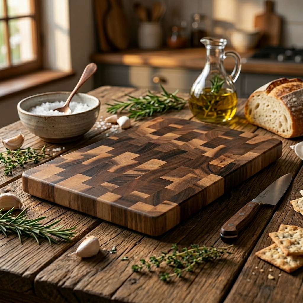 Kopshout (End-Grain) Perfectie: In tegenstelling tot normale planken snij je hier tussen de houtvezels door in plaats van ze kapot te snijden. Resultaat? Je messen blijven vlijmscherp en de plank gaat generaties lang mee. 🌳