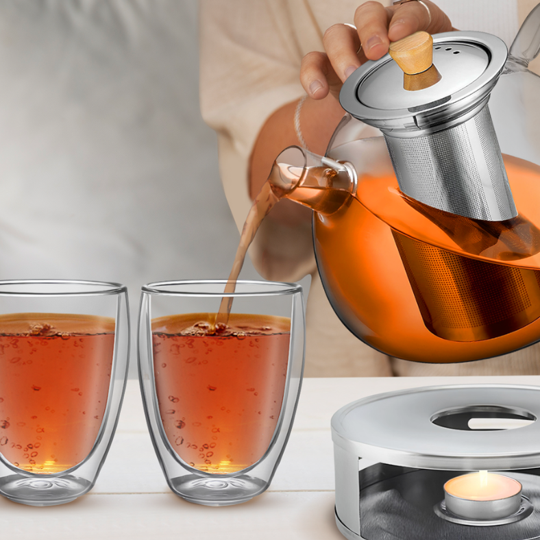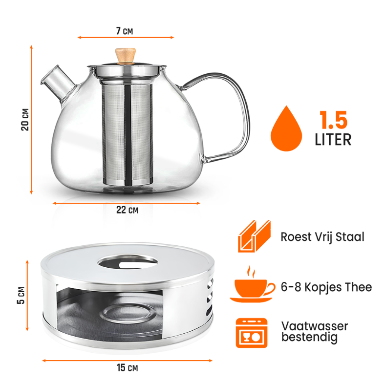 Warmhoudersset: Met de bijgevoegde RVS warmhoudersset blijft je thee langer op de perfecte temperatuur, zodat je op elk moment van een warme kop kunt genieten.